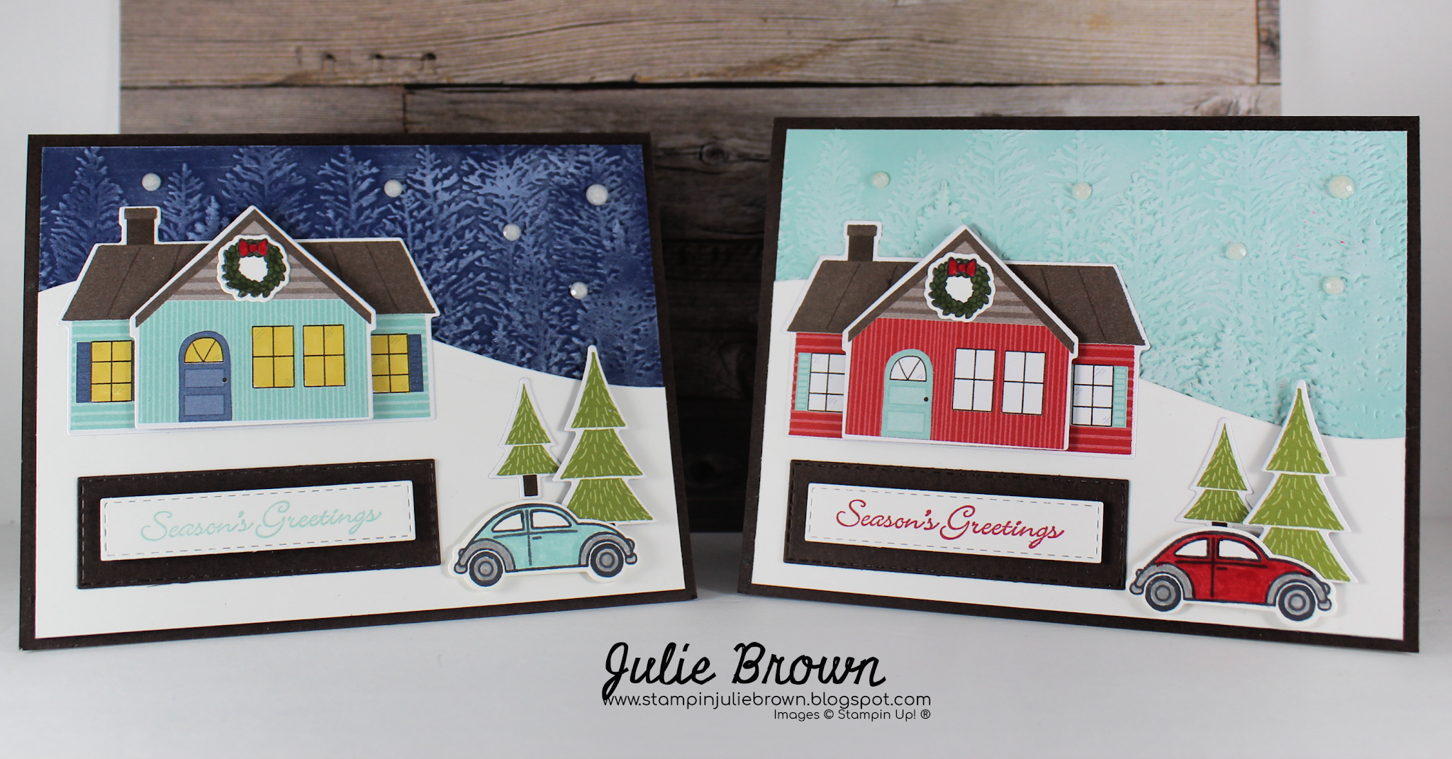 8. Adhere the small house to onto the front of the large house using Stampin Dimensionals. Then adhere to card front as shown.