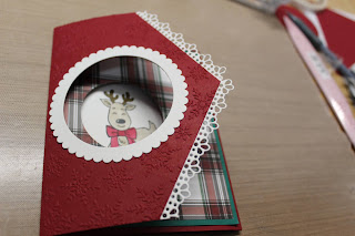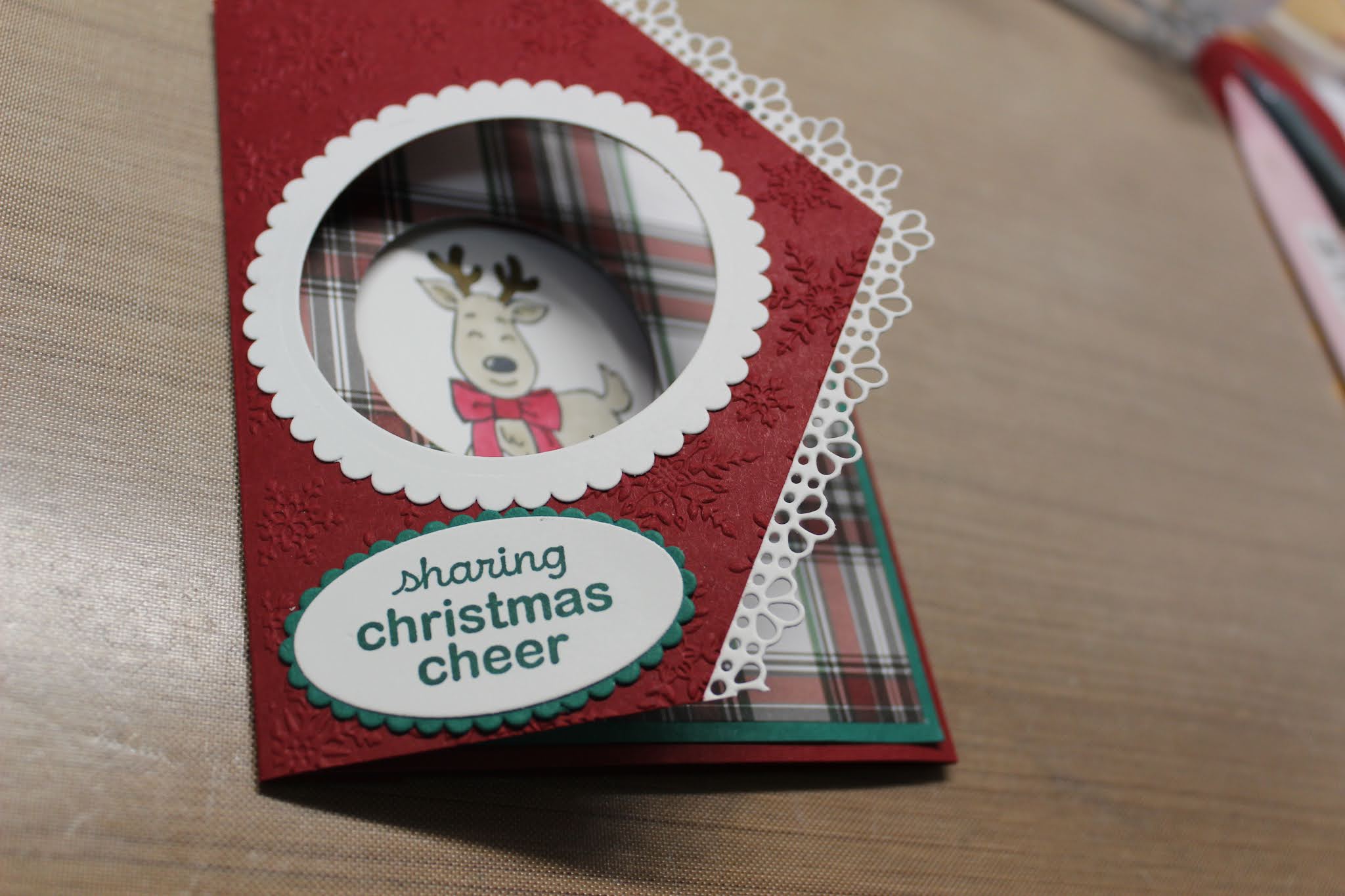 I just love the deer in the peep hole! Plus I really like the Plaid Tidings Designer series paper it really pops in this card!